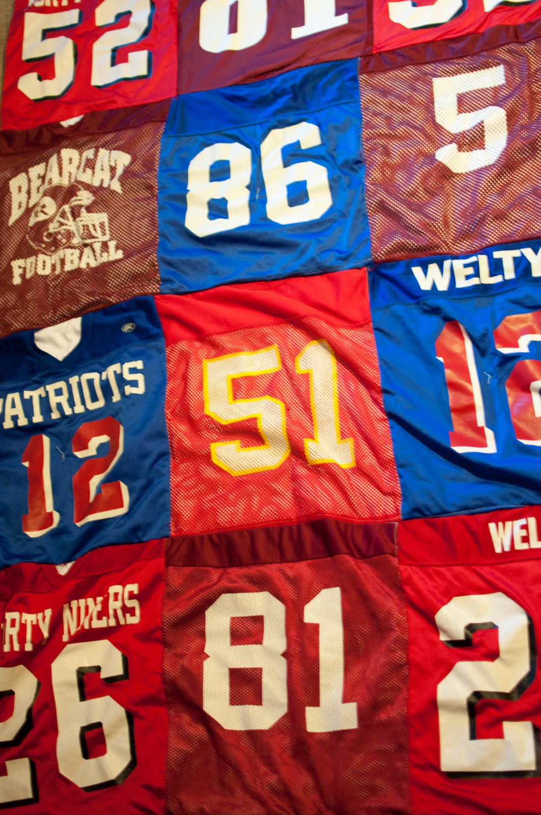 So for Father's Day this year I made him this quilt! Its made from all his football jerseys growing up and I just cut them all up and sewed them together. Maybe I shouldn't say "just" because it literally took me weeks to do, but it was so worth it to show Brian how much I love him!